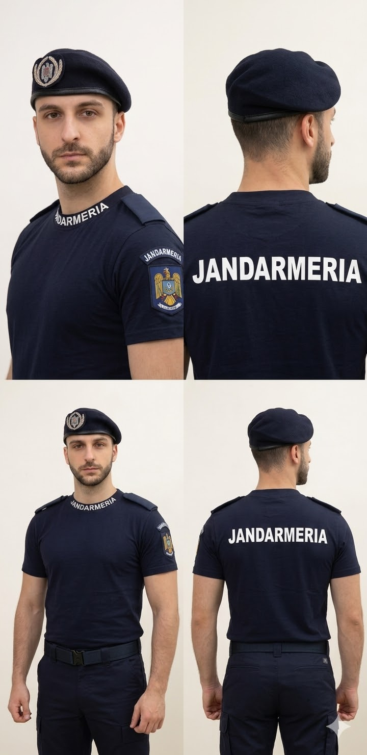 - La baza gâtului ,pe gulerul  ce își păstrează forma la purtări și spălări repetate, menținându-și aspectul îngrijit.,este personalizat cu JANDARMERIA direct pe bentita de tip patent, iar pe spate  este personalizat  prin transfer termic  cu JANDARMERIA ambele personalizari realizate cu folie de tranfer termic alba de o calitate superioara.